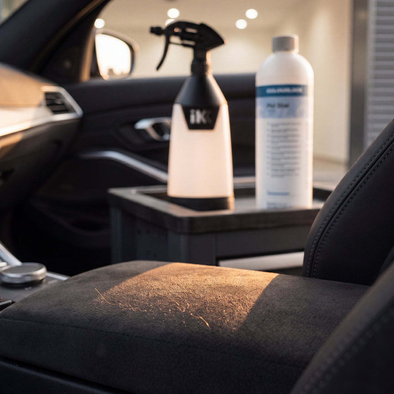 Too high a concentration leaves surfactant residues, which become visible as light rings on the fabric when drying. This is particularly noticeable on dark Alcantara and colored upholstery. Therefore, always start at 1:10 and only increase if the soiling remains after the first pass. Surfactant residues also act as a dust magnet — the surface then gets dirty again faster. Solution: wipe thoroughly with clear water after cleaning.