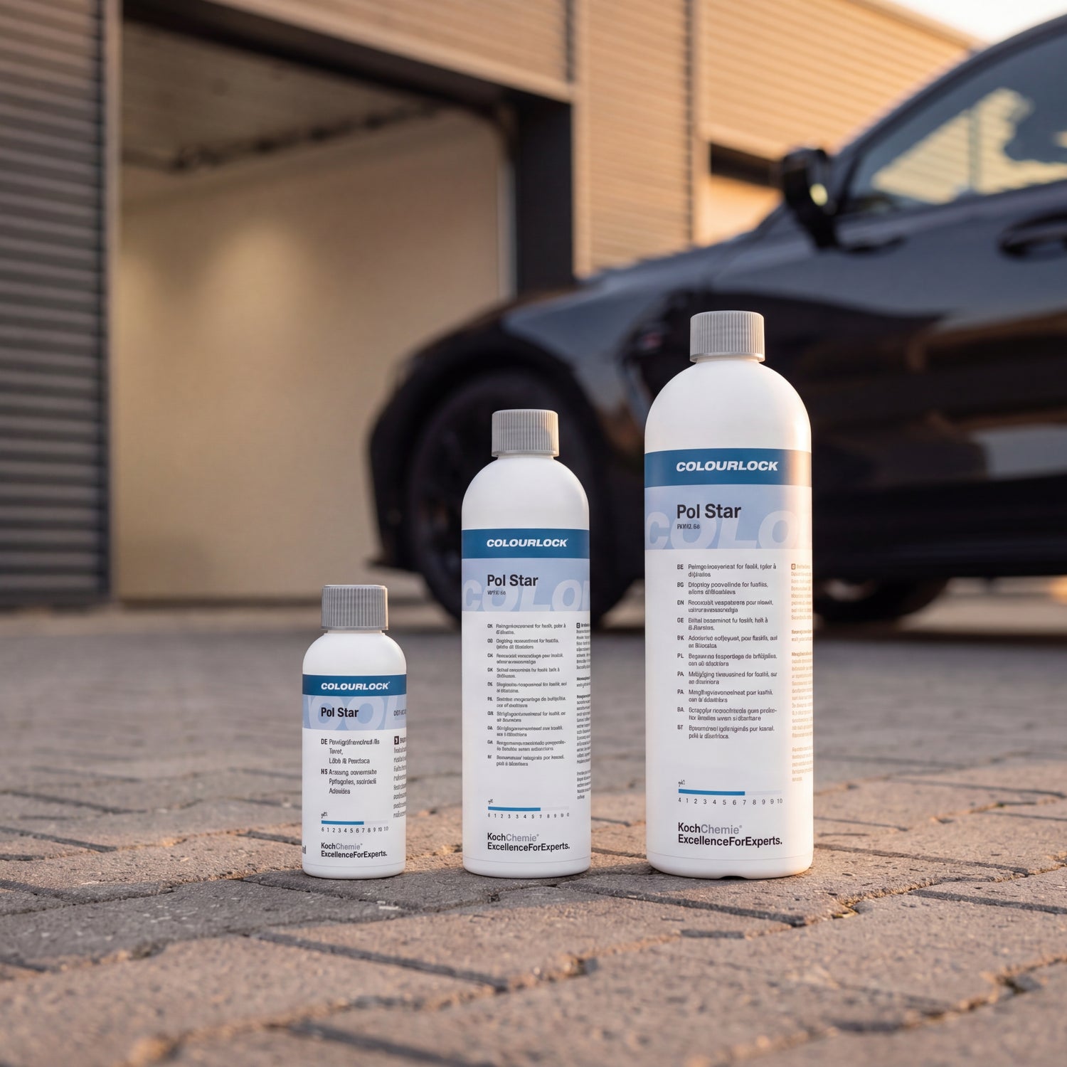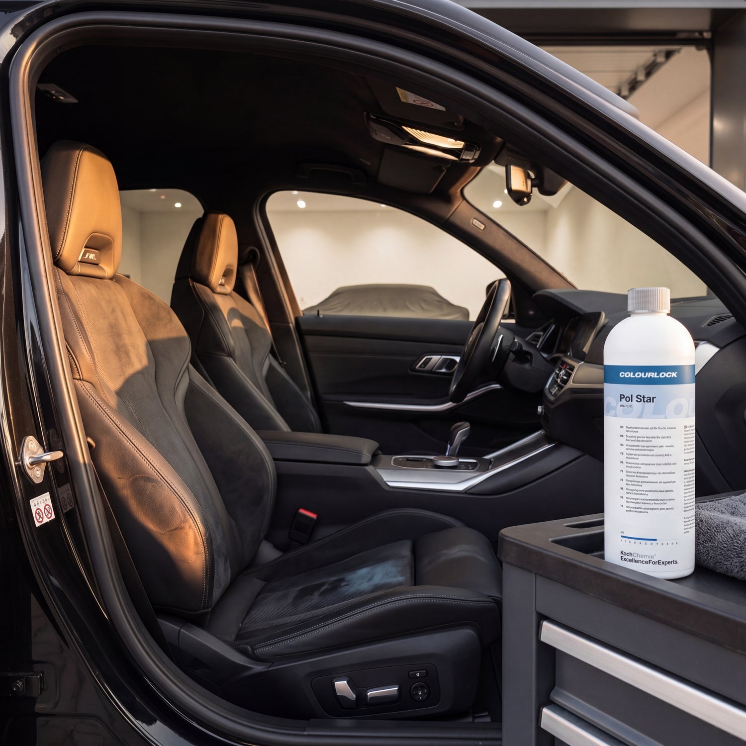 What is COLOURLOCK Pol Star? A pH-neutral cleaner concentrate from Koch-Chemie and COLOURLOCK for textiles, Alcantara, and surface-dyed smooth leather, diluted 1:5 to 1:20. Not suitable for anilines and open-pored suede leathers like nubuck or wild leather.