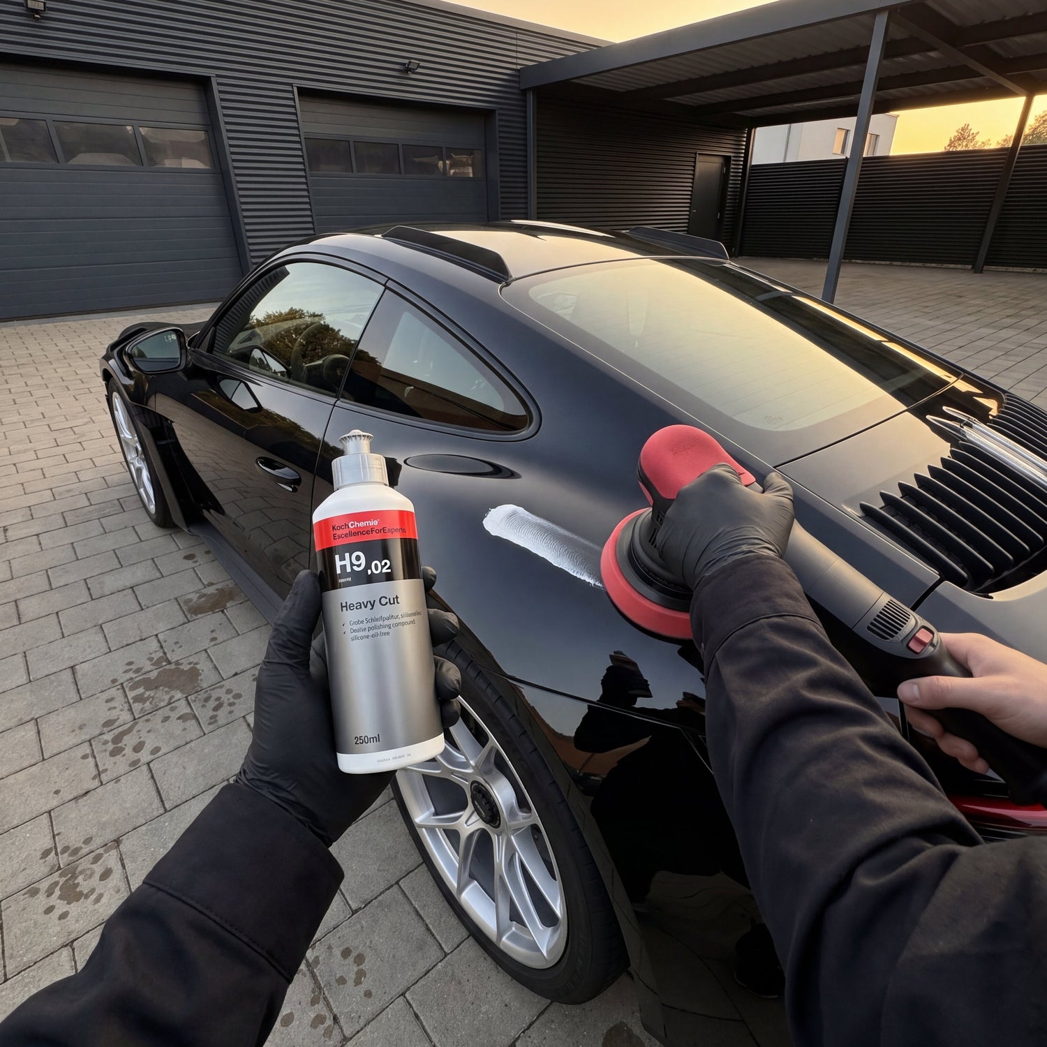 Koch-Chemie Heavy Cut H9.02 is a correction polish, not a repair. Anything within the clear coat thickness — swirls from car washes, roller marks, sanding marks after wet sanding up to P1200, water spot etching, light bird dropping etching, UV matting — can be corrected in one to three passes. Anything that already reaches into the paint layer or primer cannot be repaired with any polish in the world.