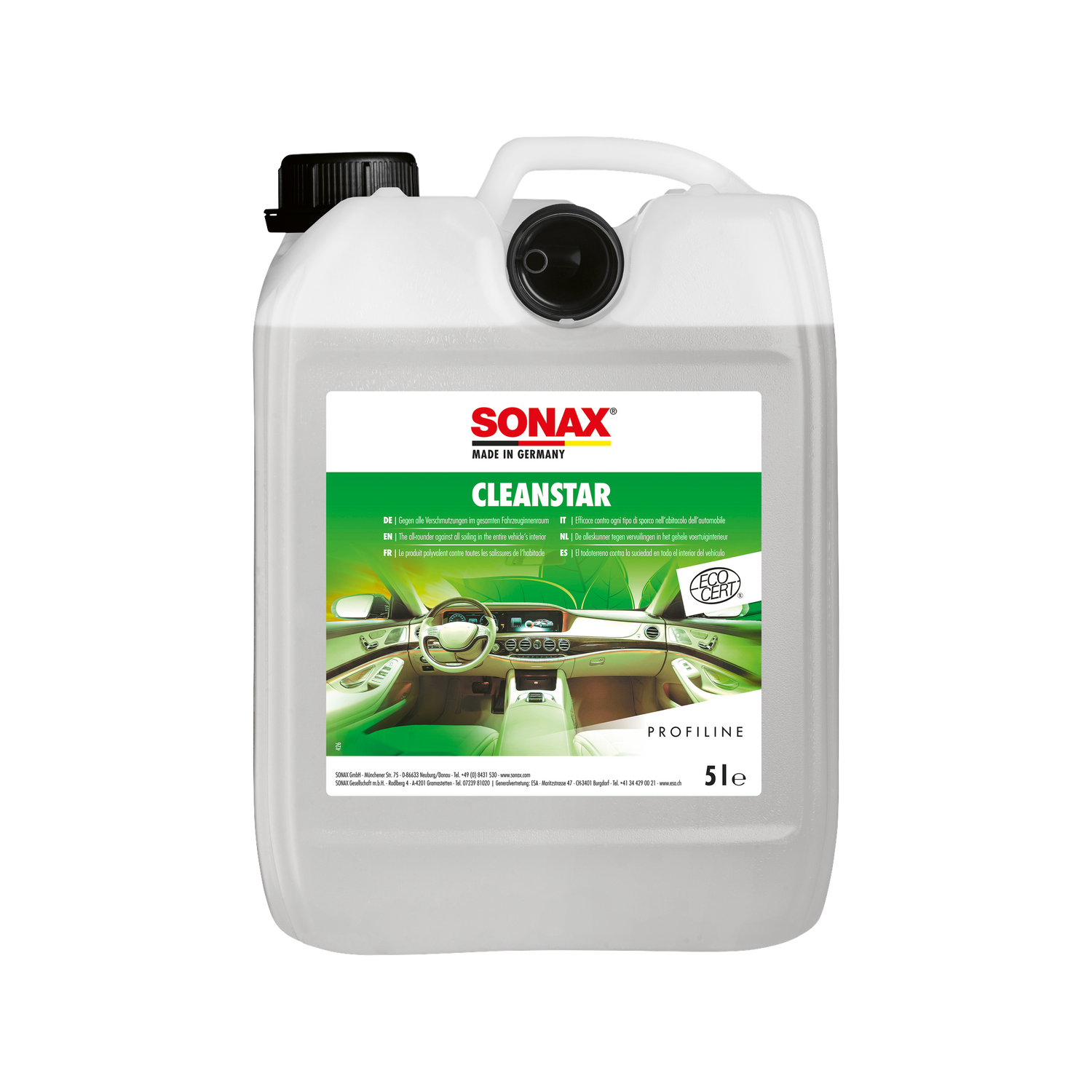 The SONAX PROFILINE CleanStar Ecocert is an Ecocert-certified interior cleaner for all surfaces in the vehicle interior — gentle, biodegradable, and highly effective. Removes dust, fingerprints, and dirt from plastic, rubber, glass, and textiles without harsh chemicals. Available in 5L, 25L, and 200L for professional businesses.