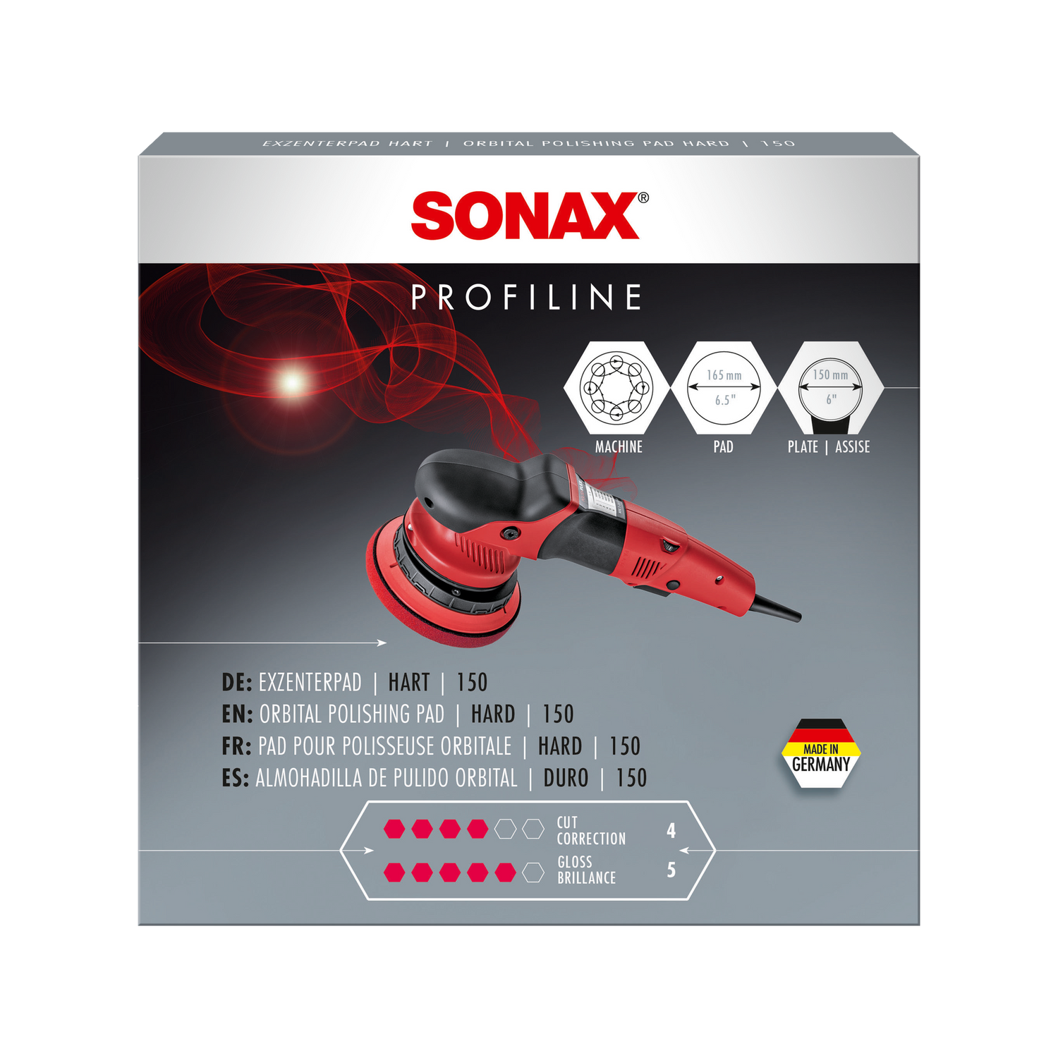 The ExzenterPad hard is designed for use with heavy-cut polishes — in the PROFILINE system for combination with SONAX PROFILINE CutMax "6/4" abrasive polish or PROFILINE EX "05-05" abrasive polish. This combination is designed for vehicles with sanding marks from P1000 sandpaper, heavy holograms from automatic car washes, and medium to deep oxidation.