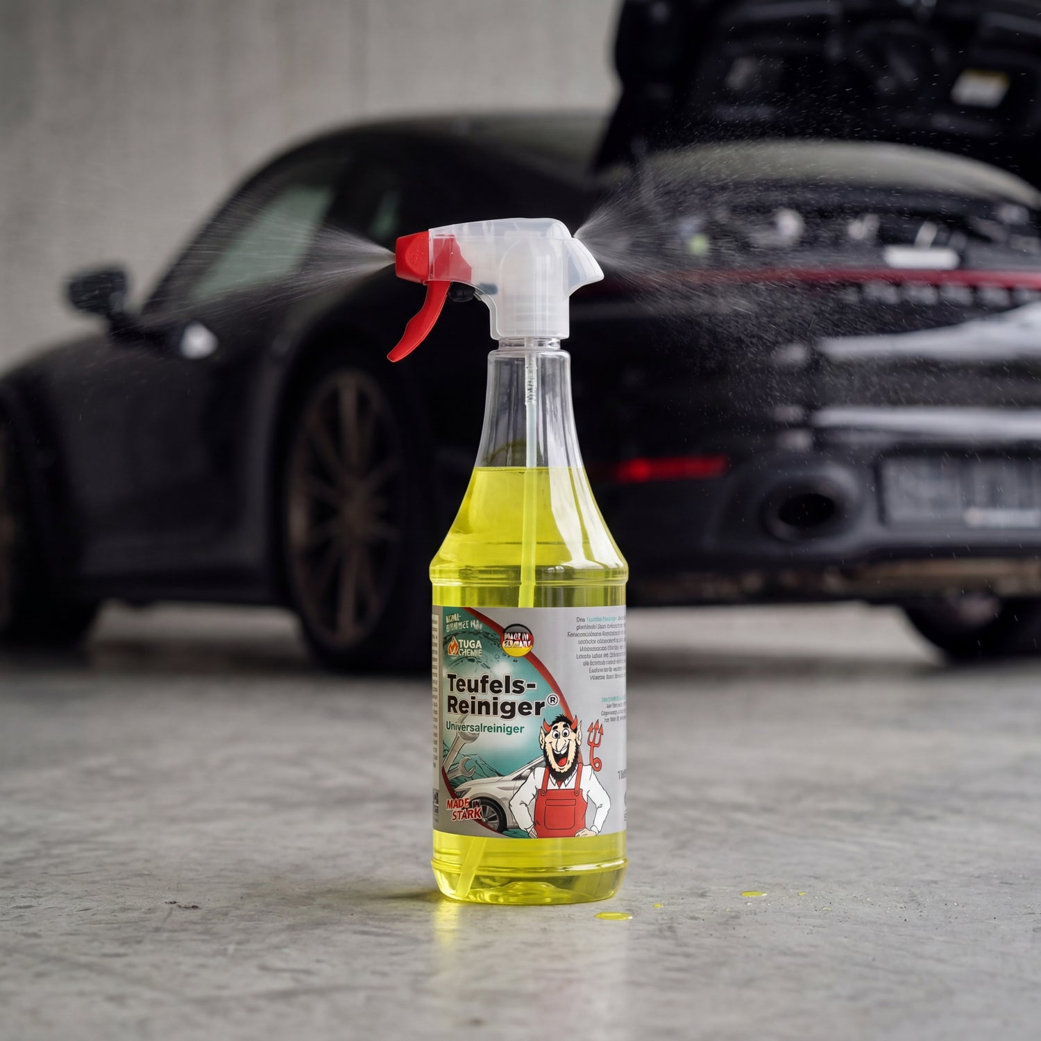 TUGA Chemie Teufels-Reiniger 1L spray bottle with yellow liquid and red spray trigger on concrete forecourt in front of black Porsche 911 with open rear