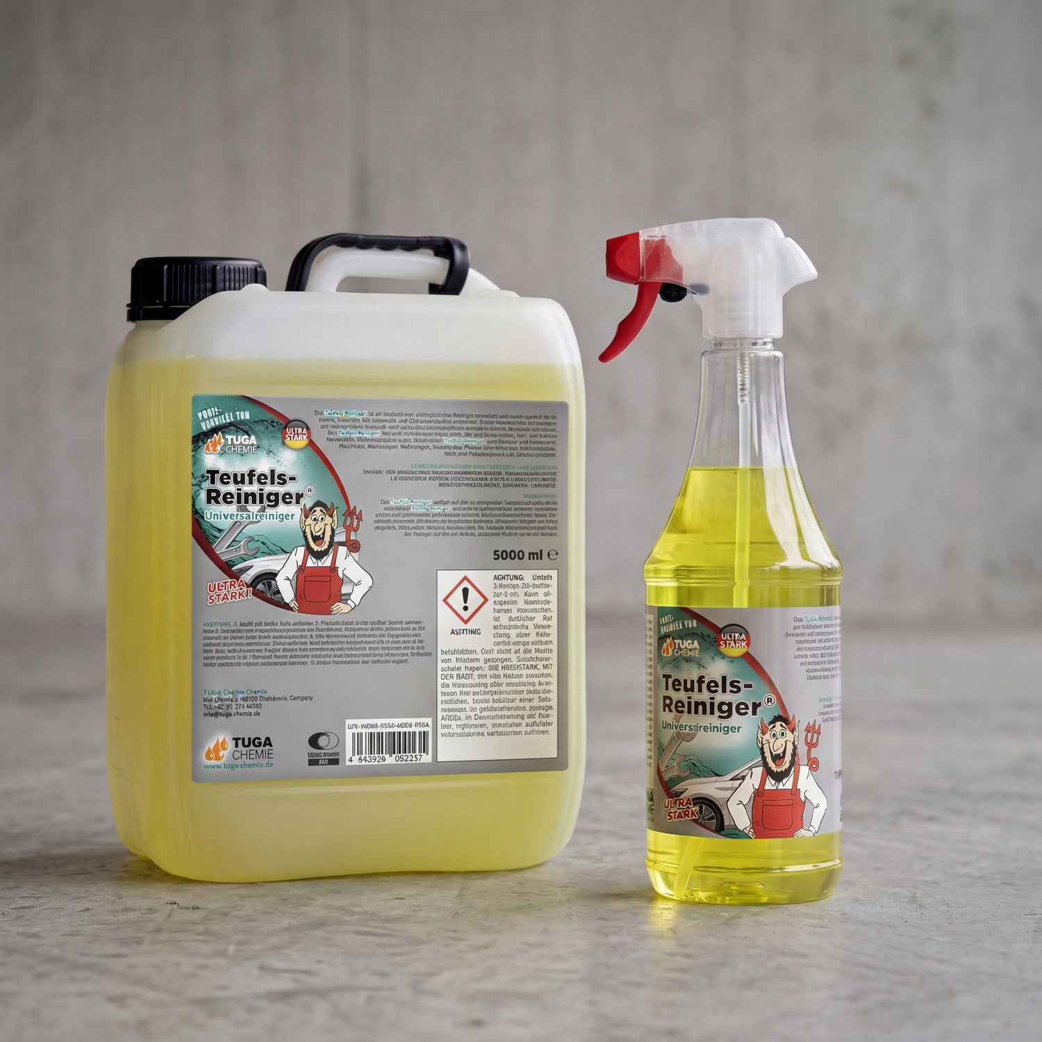 TUGA Chemie Teufels-Reiniger 5 liter canister and 1 liter spray bottle side by side on concrete forecourt