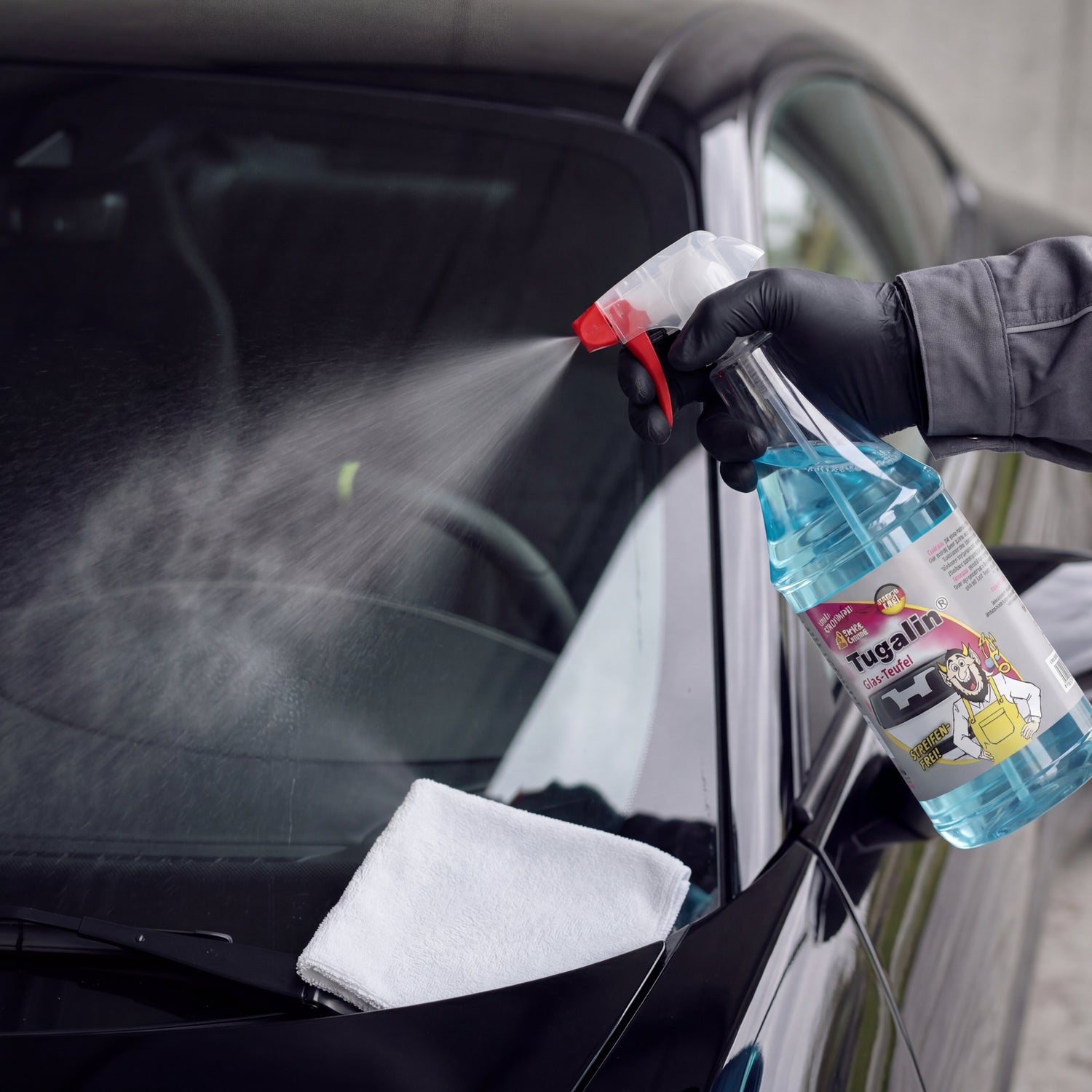 In the TUGA Chemie product range, Tugalin is the all-rounder for all glass surfaces on and in the vehicle. It complements the Kunststoff-Teufel for the cockpit, the Alu-Teufel Spezial for the rims and fits into the glass cleaning category. In the classic detailing sequence, Tugalin always comes last, when all other surfaces are finished. The reason: during every preceding work step, fine splashes can get onto the windows, which are then removed with Tugalin at the end. Anyone who goes through their car once a month will find daily use of Tugalin the most relaxed way to keep the windows clear, mirrors streak-free, and displays maintaining their factory contrast.
