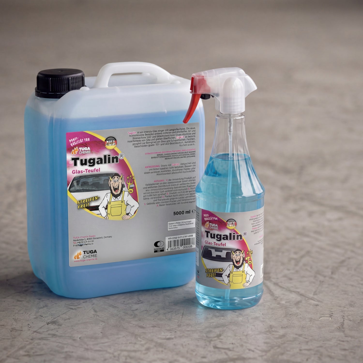 Tugalin is TUGA Chemie's iconic blue glass cleaner, ready-to-use and based on isopropanol and slow-evaporating surfactants. It cleans car glass, mirrors, displays, piano lacquer, and high-gloss surfaces without streaks, removing nicotine film, insect residue, fingerprints, and the greasy fogging layer from interior windows. The alcohol-surfactant balance remains liquid long enough for you to wipe in straight lines without streaks drying. Spray directly and work in with a short-pile glass cloth, then polish with a dry microfiber cloth. One liter is sufficient for approximately 50 complete car window cleanings. Tugalin has been produced in Germany since the 1970s and has gained a quiet cult status among workshops, car dealerships, and fleet operators. Available as a 1-liter spray bottle with a red atomizer for daily use and as a 5-liter canister for refilling for professional detailing operations.