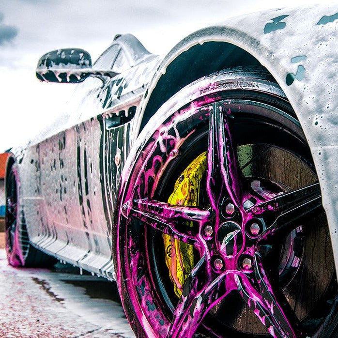 Die Anwendung des P21S POWER GEL Felgenreinigers ist einfach, aber wie beim professionellen Detailing sollte sie bewusst erfolgen. Sprühe das Produkt gleichmäßig auf die trockene, abgekühlte Felge. Durch die Gel-Haftung bildet sich sofort ein dünner Film, der auch an schwer zugänglichen Stellen haftet – zwischen Speichen, im Felgenbett oder hinter den Schrauben. Nach etwa 3–5 Minuten Einwirkzeit färbt sich der Reiniger dunkelrot bis violett: Das ist das Zeichen, dass Bremsstaub und Metallpartikel aktiv gelöst werden. Danach einfach mit einem kräftigen Wasserstrahl oder Hochdruckreiniger abspülen. Für ein perfektes Finish bei stark vernachlässigten Felgen kannst du mit einer weichen Felgenbürste leicht nachhelfen. Wichtig: nicht antrocknen lassen und nicht in der prallen Sonne anwenden. Da der Reiniger absolut säurefrei ist, bleibt das Risiko von Korrosion oder matten Stellen gleich null – selbst bei polierten Alufelgen oder empfindlichen Mehrteiler-Felgen. Er ist außerdem RDKS-kompatibel und biologisch abbaubar, also sicher im täglichen Einsatz. Nach der Reinigung empfiehlt sich eine Felgenversiegelung, um neuen Schmutz weniger haften zu lassen.