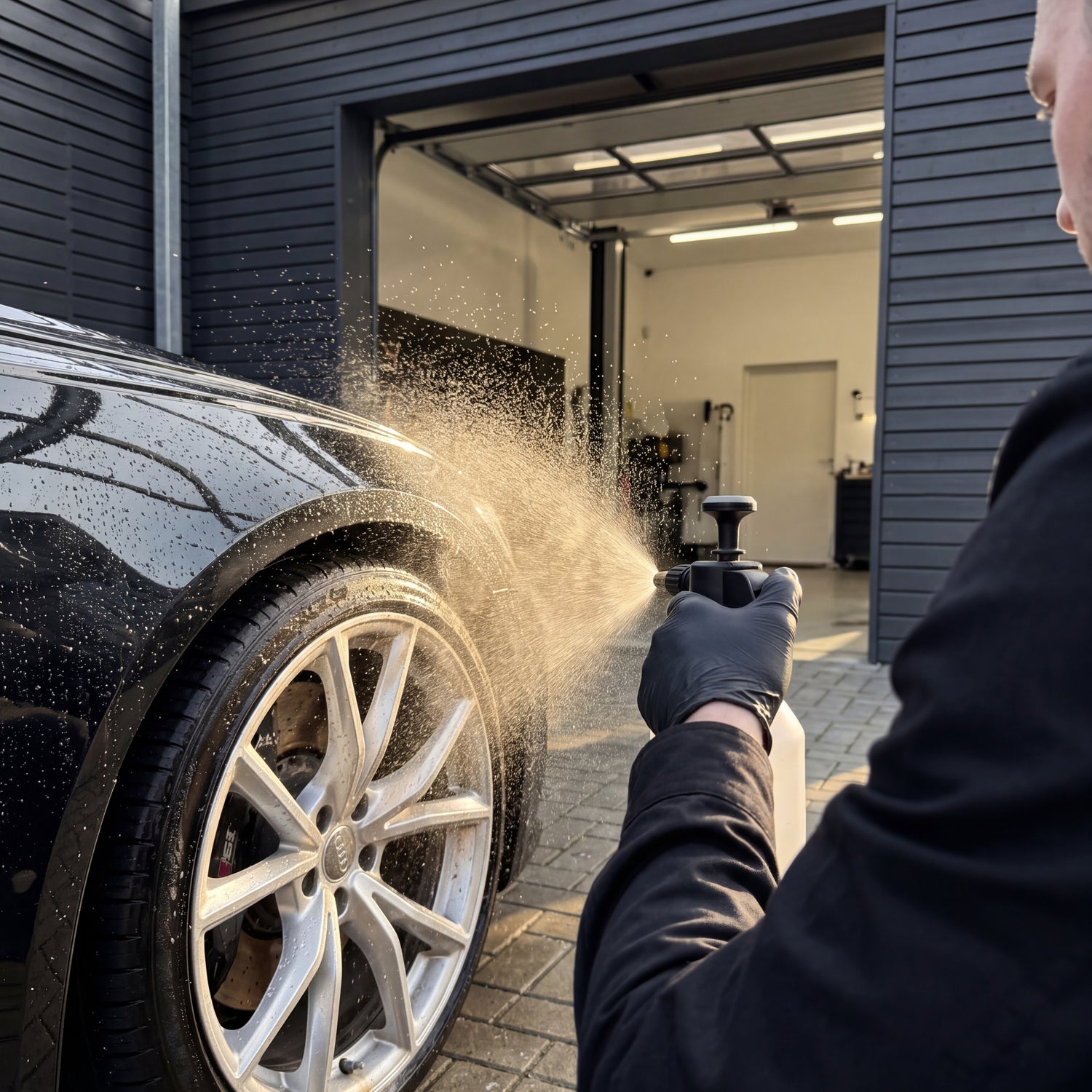 Wichtig ist die Reihenfolge im Räderbereich. Erst die Reifenflanke abdecken oder die Verdünnung punktgenau auftragen — Salzsäure kann Reifenmarkierungen ausbleichen. Dann die Felge selbst behandeln, immer in der gleichen Drehposition arbeiten, damit kein Bereich übersehen wird. Nach dem Abspülen visuell prüfen und nur bei sichtbarem Restschmutz einen zweiten Durchgang ansetzen — bei richtig dosierter Erstanwendung ist das selten nötig.