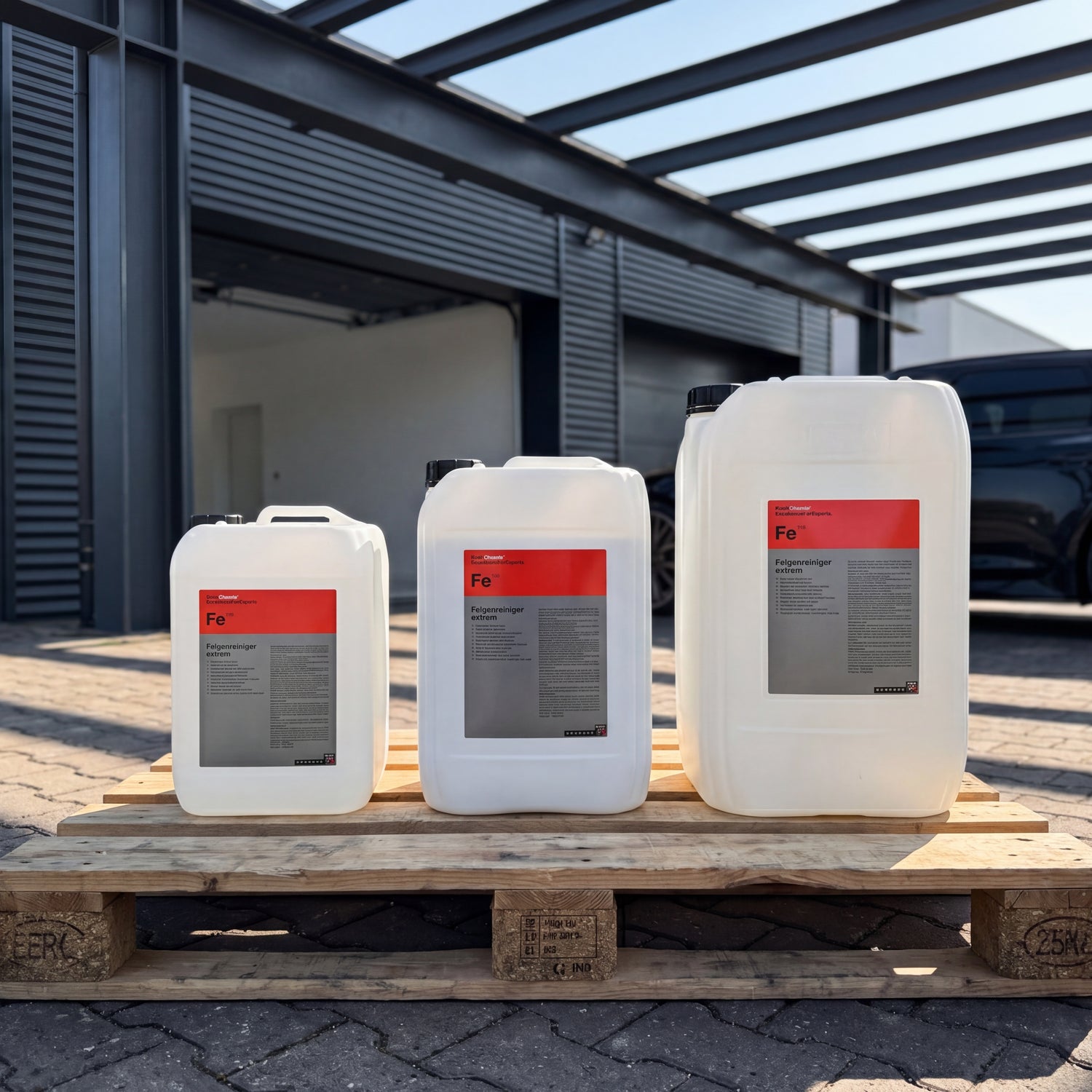 Koch-Chemie Felgenreiniger extrem "Fe" ist ein extrem saurer Spezialreiniger von Koch-Chemie auf Salzsäurebasis (HCl), der anorganische Verschmutzungen wie eingebrannte Bremsstäube, Eisenoxid und Kalkschleier chemisch auflöst. Mit einem pH-Wert von -0,2 gehört er zu den stärksten Reinigern im Koch-Chemie Sortiment und ist ein reines Werkstatt- und Industrieprodukt — keine Gebindegröße unter 11 kg, keine Sprühflasche, kein Endkundenformat.