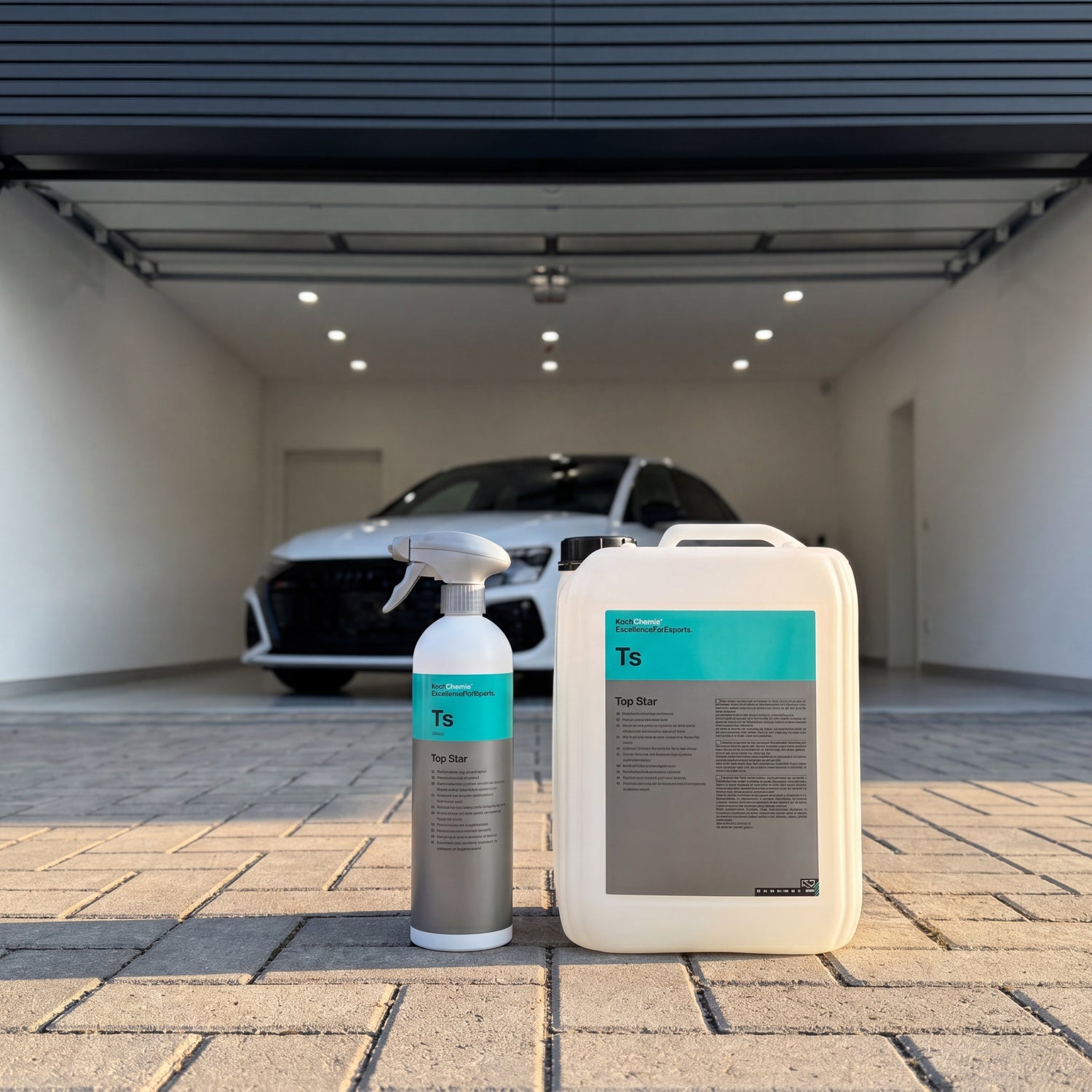 Der Top Star "Ts" ist in 1000 ml Sprühflasche und im 10-Liter-Kanister verfügbar. Die 1000-ml-Flasche reicht für etwa 80–100 Innenraumanwendungen — ein Jahresvorrat für einen Zweiwagen-Haushalt. Der 10-Liter-Kanister ist für Aufbereiter und Werkstätten gedacht, die pro Woche 5 oder mehr Fahrzeuge durchschleusen. Zielkunde ist nicht der Sonntagsputzer, sondern der Detailing-Enthusiast und der Fahrzeugaufbereiter, der ein dezentes Seidenmatt ohne typischen Cockpitspray-Glanz will.